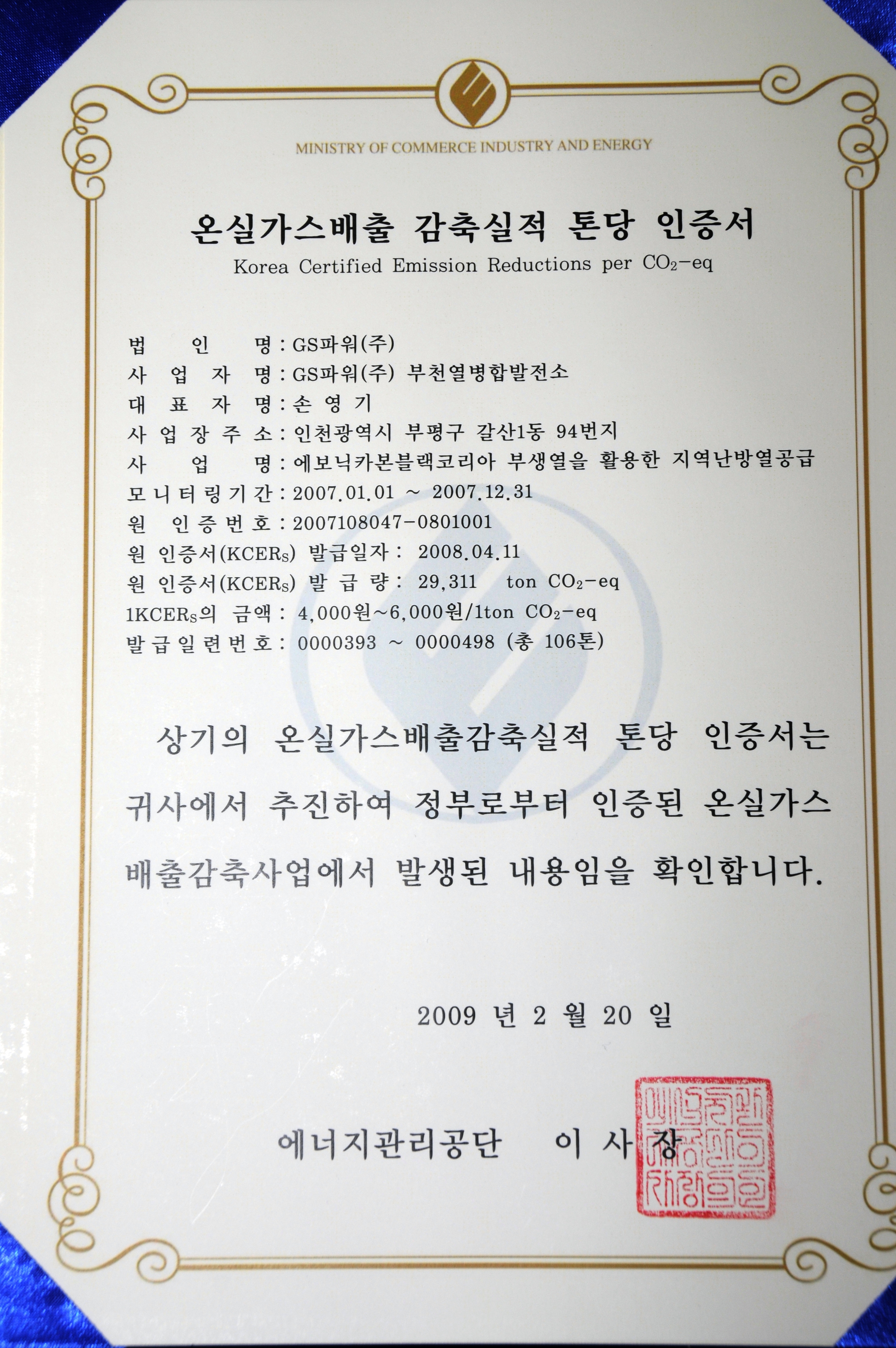‘탄소중립프로그램’에 참여한 전라남도청등 7개 기관에 국내최초로 625톤의 온실가스 감축실적을 판매하여 지식경제부로부터 인증서를 수여 받았다.
