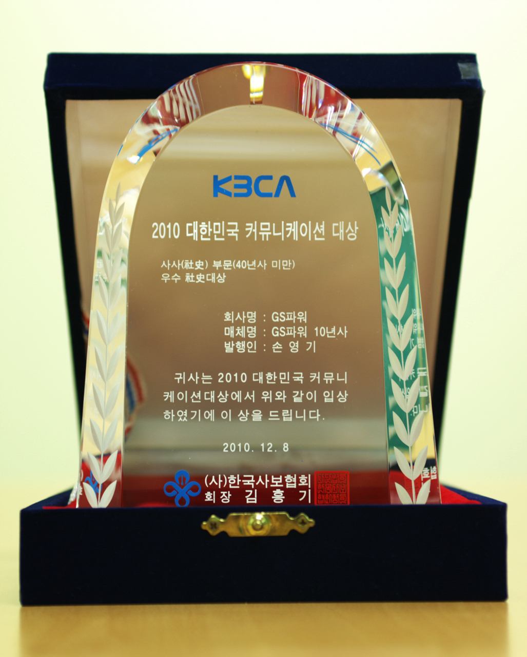 GS파워 10년사 - 『새로운 에너지를 만드는 진정한 힘』이 지난 12월 8일 사단법인 한국사보협회가 주관한 2010 대한민국 커뮤니케이션 대상에서 사사부문 우수상을 수상하였다.