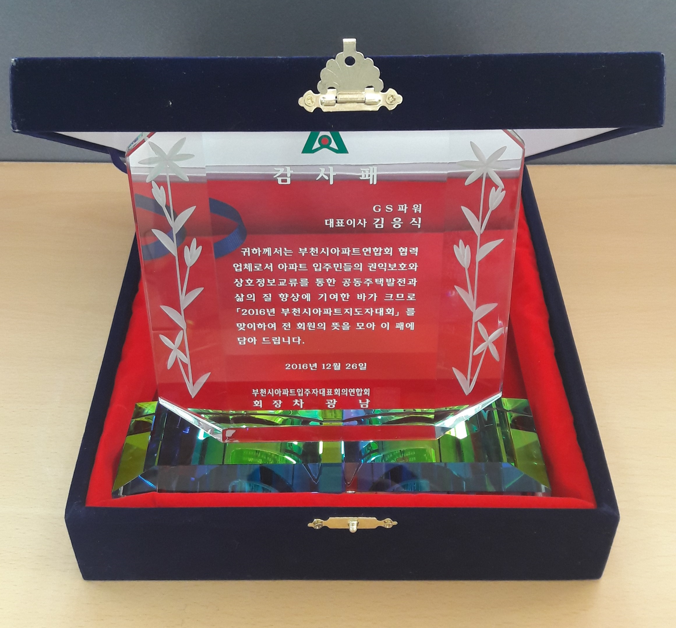 부천시 아파트연합회의 총의를 모아 GS파워 김응식 사장에게 전달된 감사패에서 차광남 연합회 회장은 GS파워는 회사 출범 이후 현재까지 청소년 육영사업과 경로사업, 지역사회 복지단체 지원, 및 지역주민 초청 열린음악회 개최 등 인근 지역사회와 함께 하는 다양한 사회공헌 활동을 활발히 전개함에 감사를 표현했다. 또한, 지역사회와의 신뢰 관계 형성에 많은 정성을 기울여 나갔고, 특히 쾌적한 지역냉난방 공급과 친환경 경영으로 모범이 되었다며 이번 수상 이유를 밝혔다.