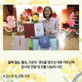 코로나19로 외부활동에 제약이 있었던 어르신들을 위하여 ▲생신상 사진촬영 ▲축하공연 감상 ▲생신선물 전달 ▲어르신과의 즐거운 만찬 등 뜻깊은 시간을 준비하였습니다.