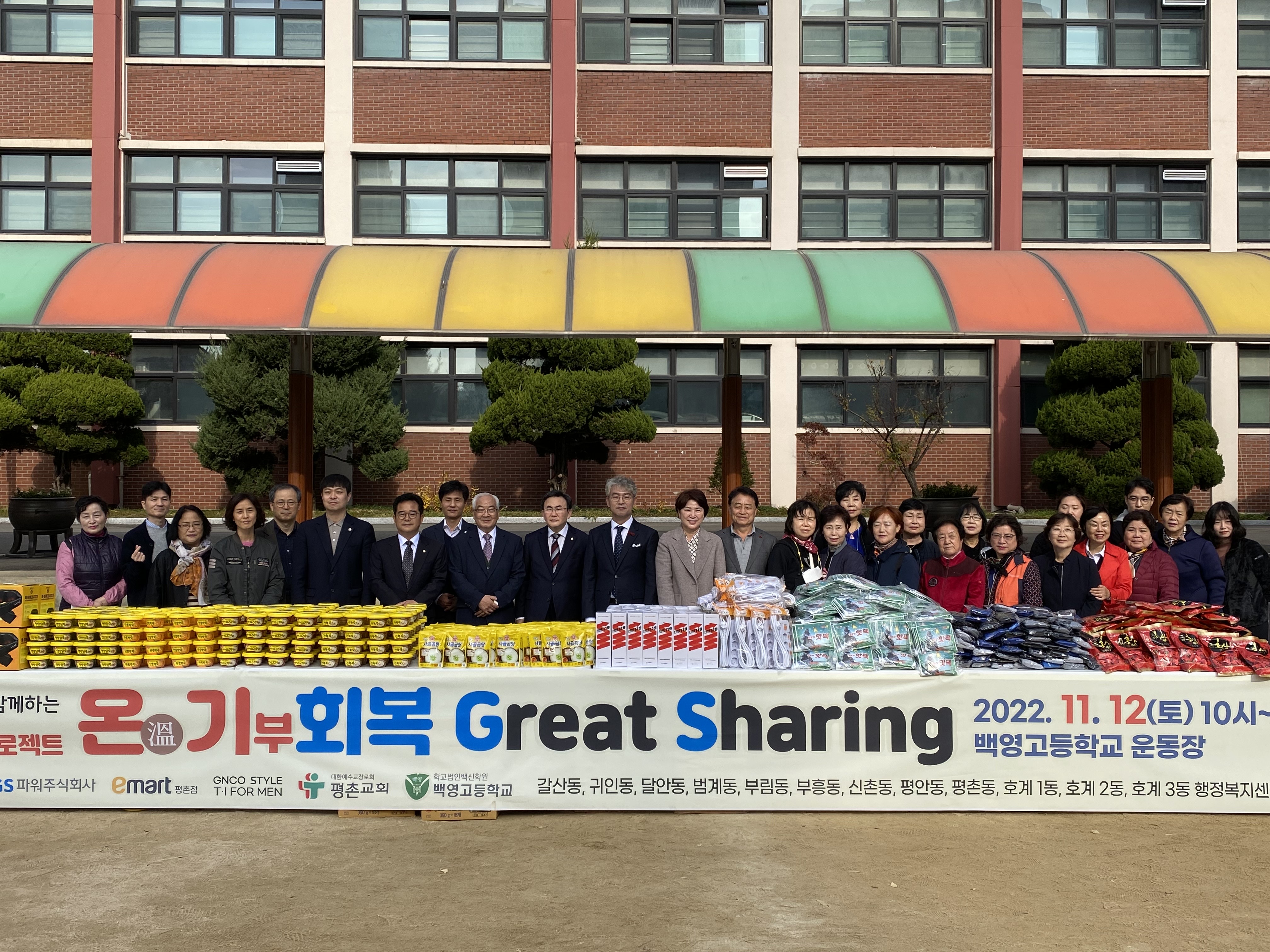 안양 백영고등학교 운동장에서 안양시 거주 어르신 200여명에 전기매트 및 이불, 겨울용품, 식료품 등을 지원하는 ‘온기회복 Great Sharing’ 나눔 행사를 가졌습니다.