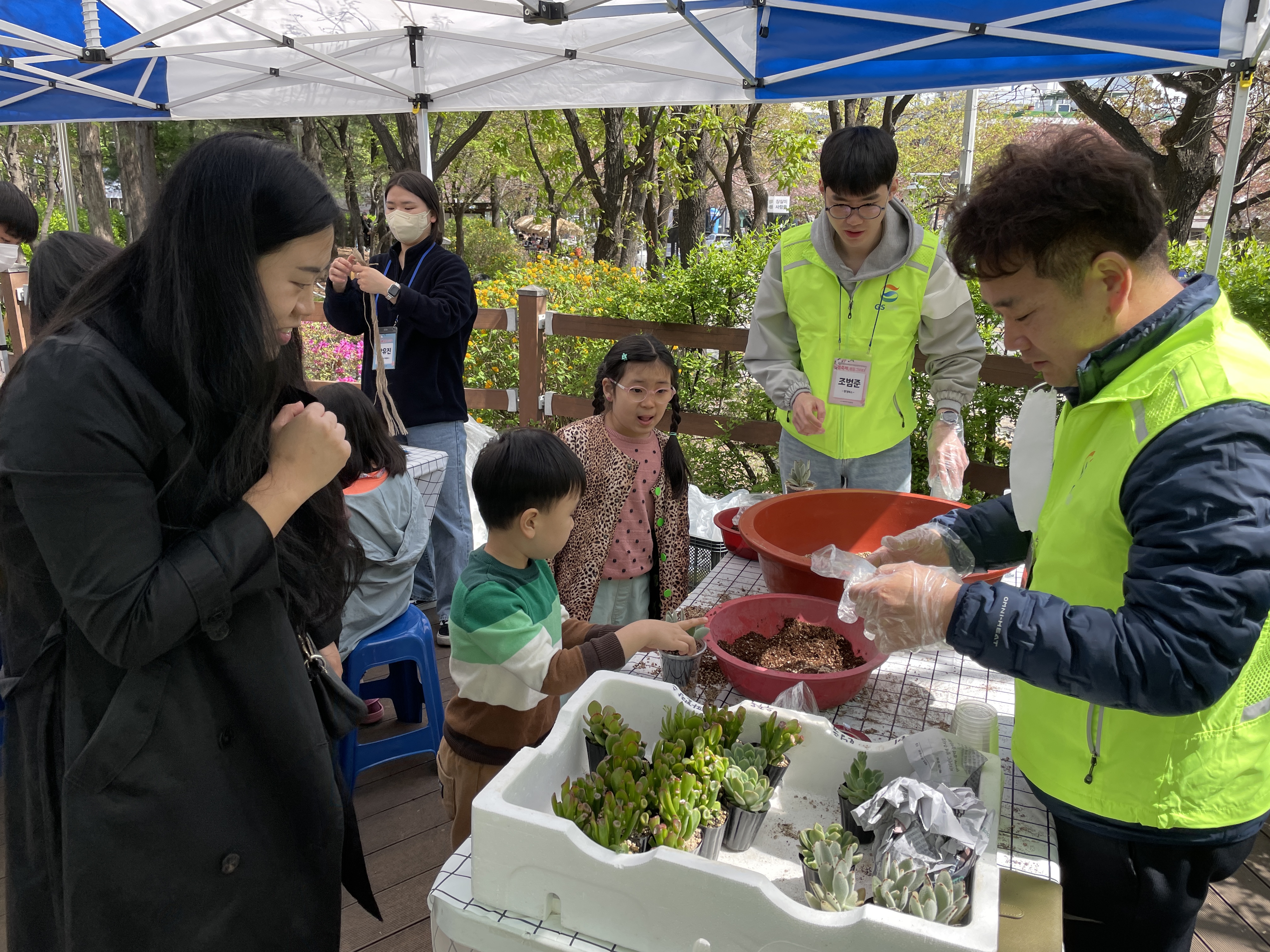 환경체험 부스는 일회용품 컵을 재활용한 화분 만들기, 아이스팩 충전재를 재활용한 방향제 만들기 등 주민들이 업사이클링 과정을 직접 체험함으로써 Less Waste를 실천하는 시간이었습니다.