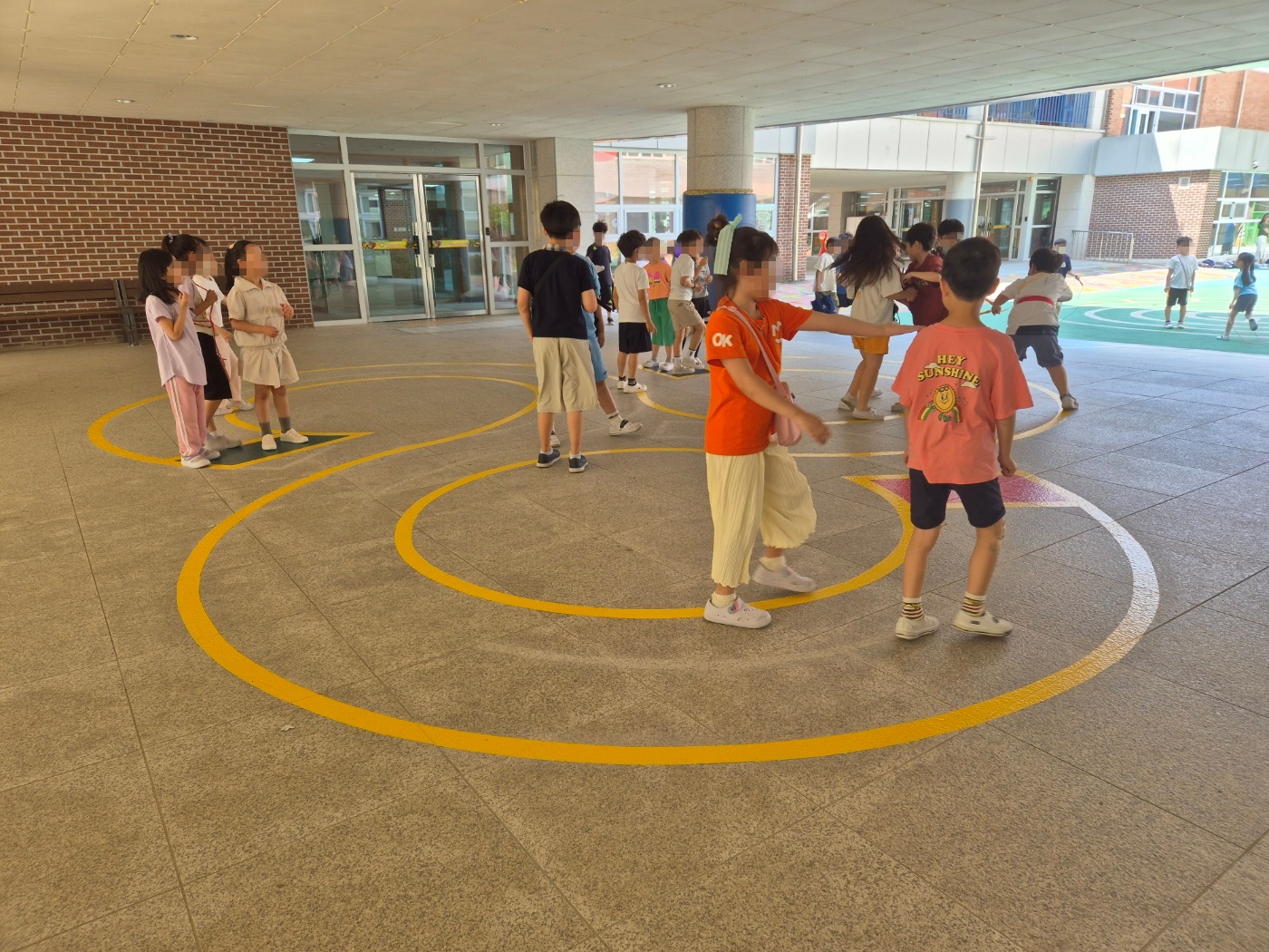 부천삼정초 바닥 그림 위에서 아이들이 사방치기 놀이를 즐기고 있다.
