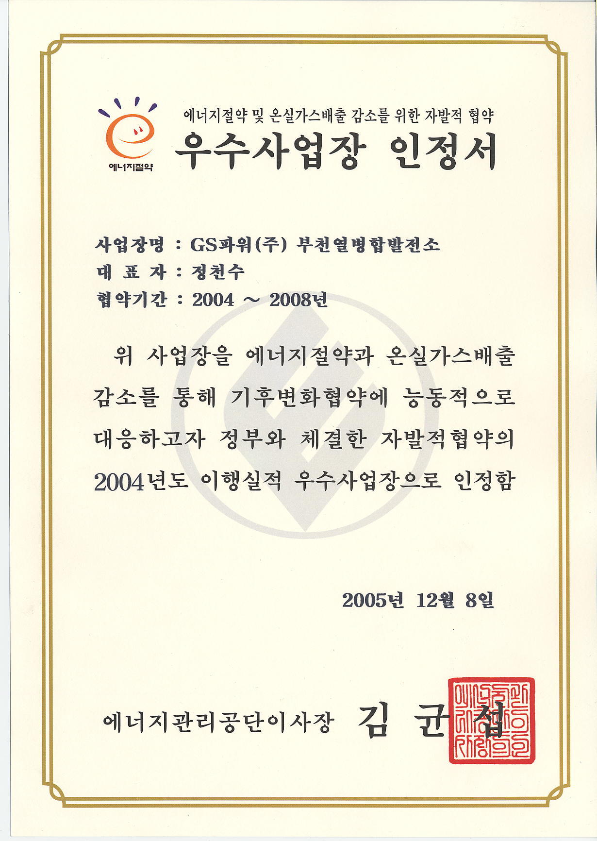 부천열병합발전소는 1월 5일 자발적협약 이행실적 우수사업장으로 선정되어 산업자원부 장관상과 자발적협약 인증서를 수여 받았다.